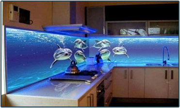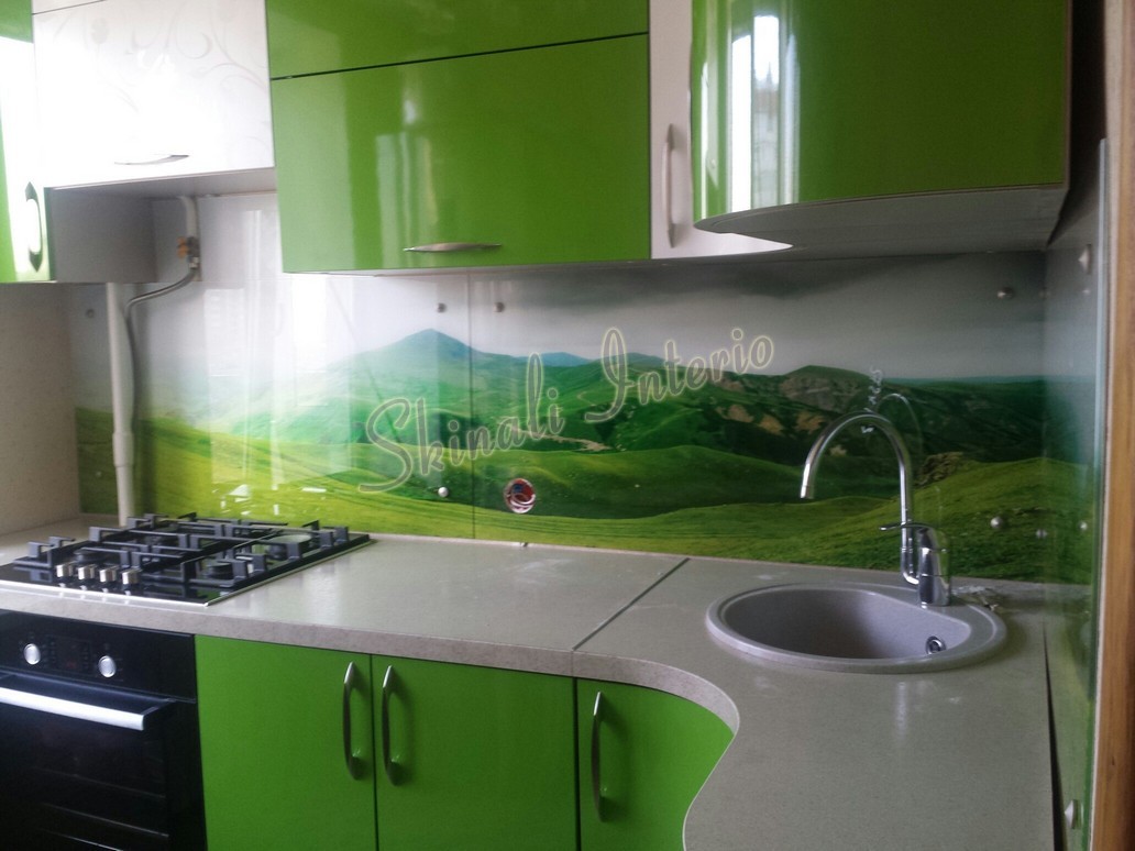 Если интерьер оформлен в стиле хай-тек, можно использовать однотонную расцветку или строгие линии. Кухню с деревянной мебелью органично дополнит изображение натюрморта или пейзажа. Очень популярны скинали в морской тематике. Какие-либо ограничения при выборе изображения отсутствуют, все зависит от вашей фантазии и личных предпочтений. Оригинальный декоративный эффект стекла в сочетании с уникальным рисунком и практичностью – главные аргументы в пользу выбора скинали. А глянцевая поверхность придаст зеркальность и объемность, увеличив пространство помещения.
